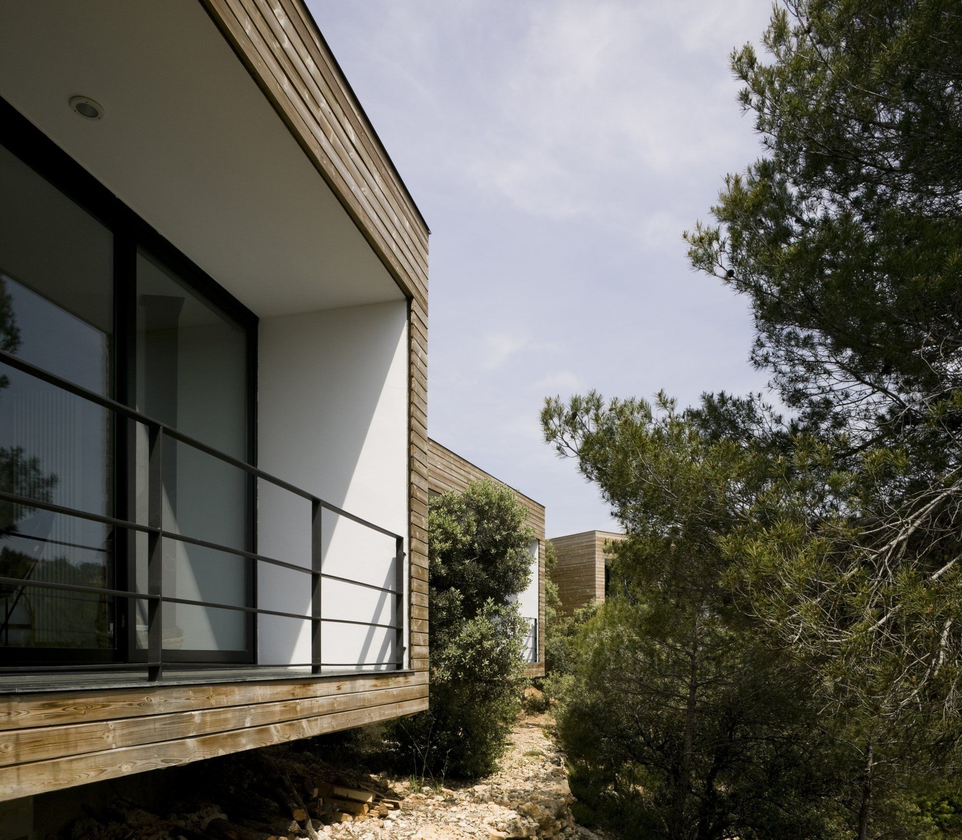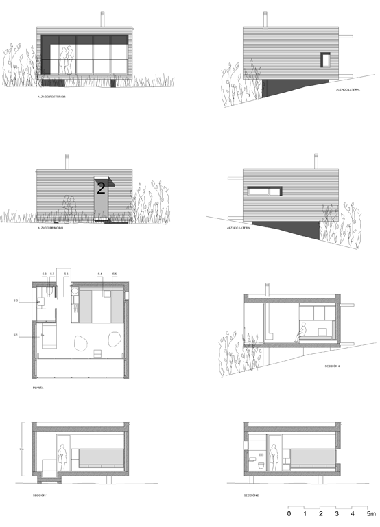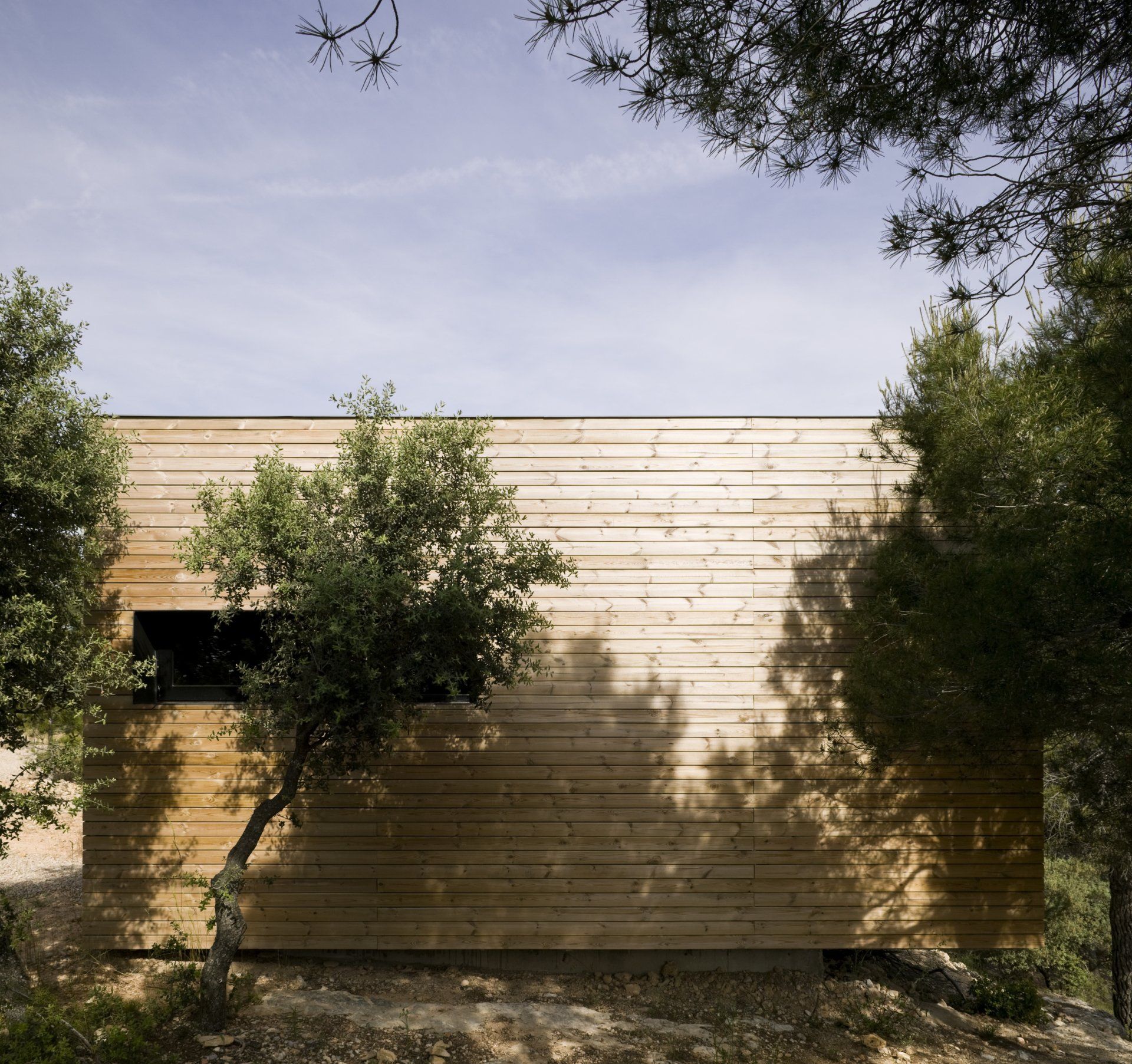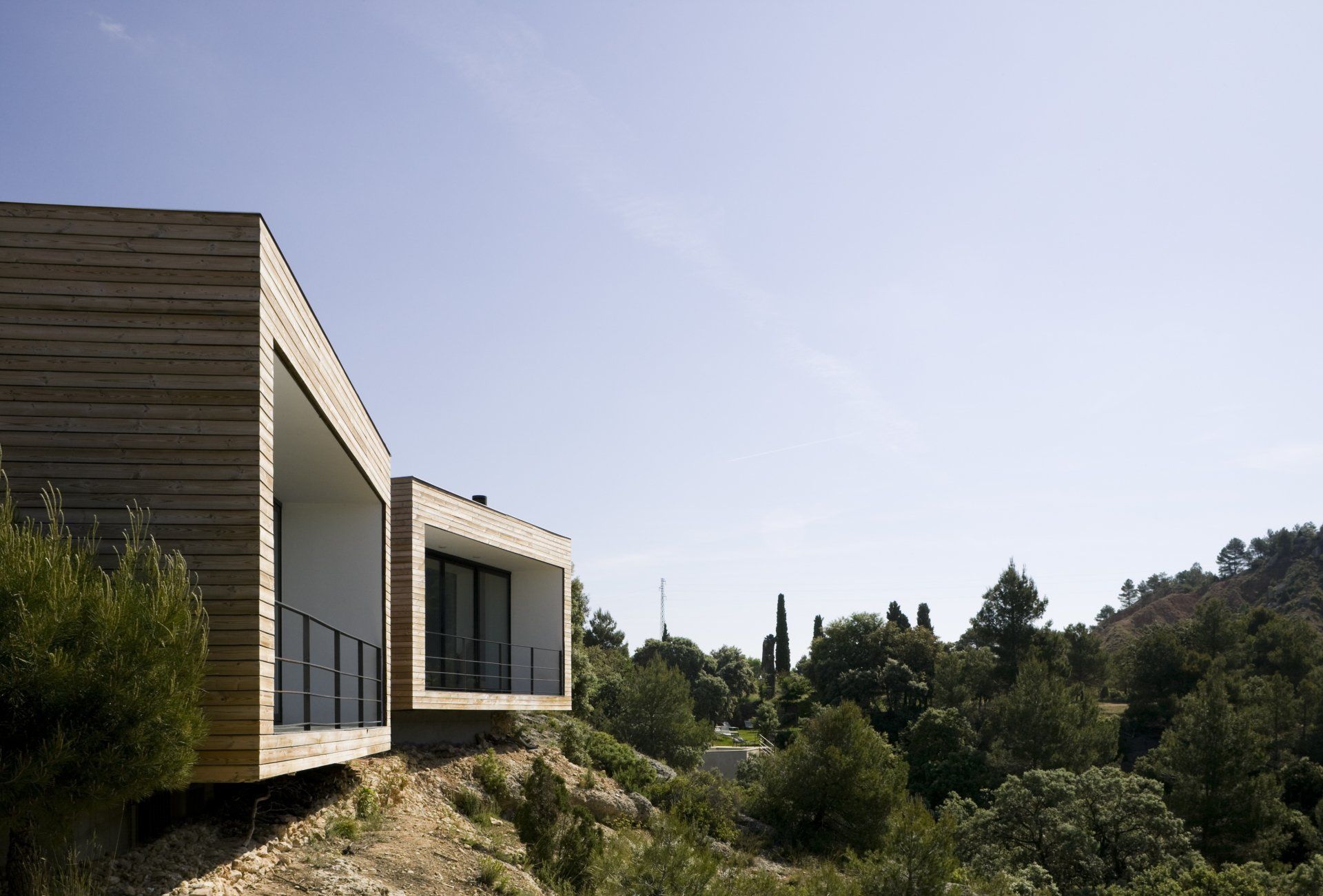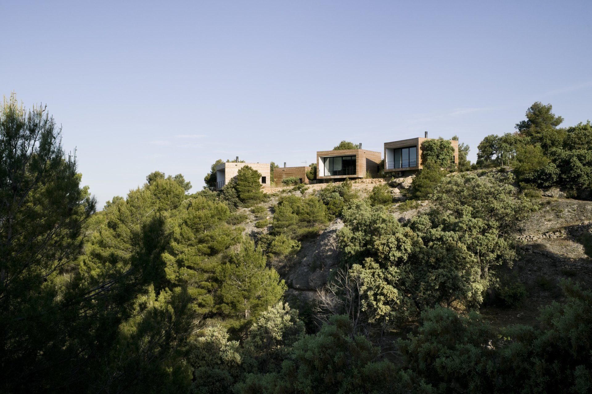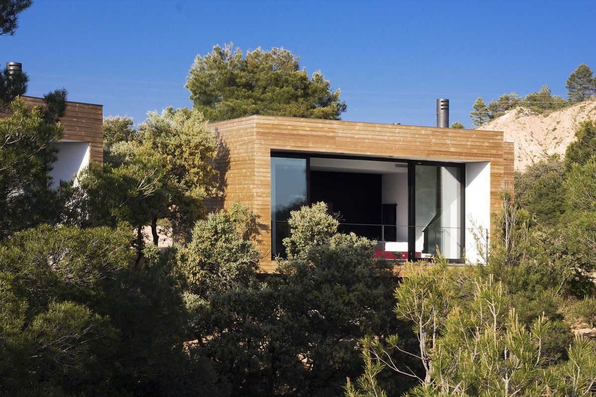Las habitaciones exteriores aparecen entre la vegetación como unas cajas cuadradas y compactas revestidas de pino cuperizado en voladizo sobre una base de hormigón. Están abiertas por una sola cara para tener el máximo de privacidad posible, se colocan en el inicio de la pendiente con el objetivo de disfrutar de las espectaculares vistas y al estar orientada a sur se coloca un porche para protegerse del sol del verano. Por la cara opuesta se produce la entrada y en las otras dos fachadas colocamos aberturas pequeñas para la ventilación i iluminación del baño y de la zona de la cama.