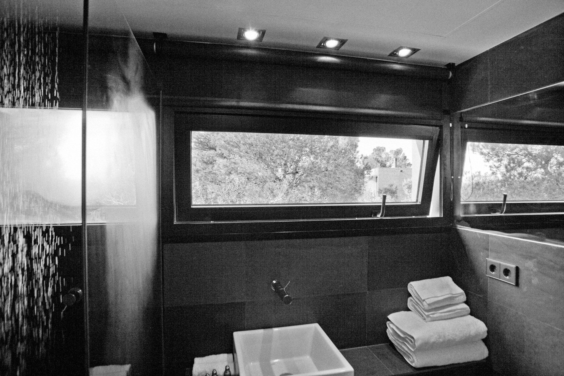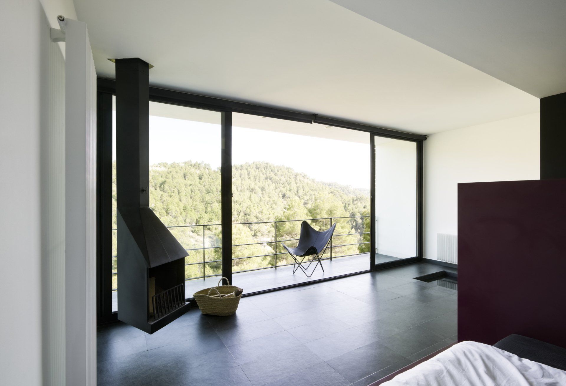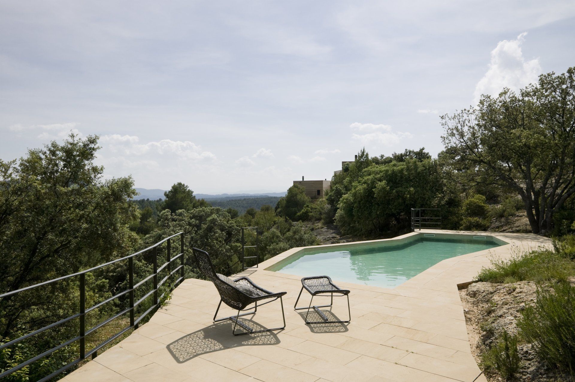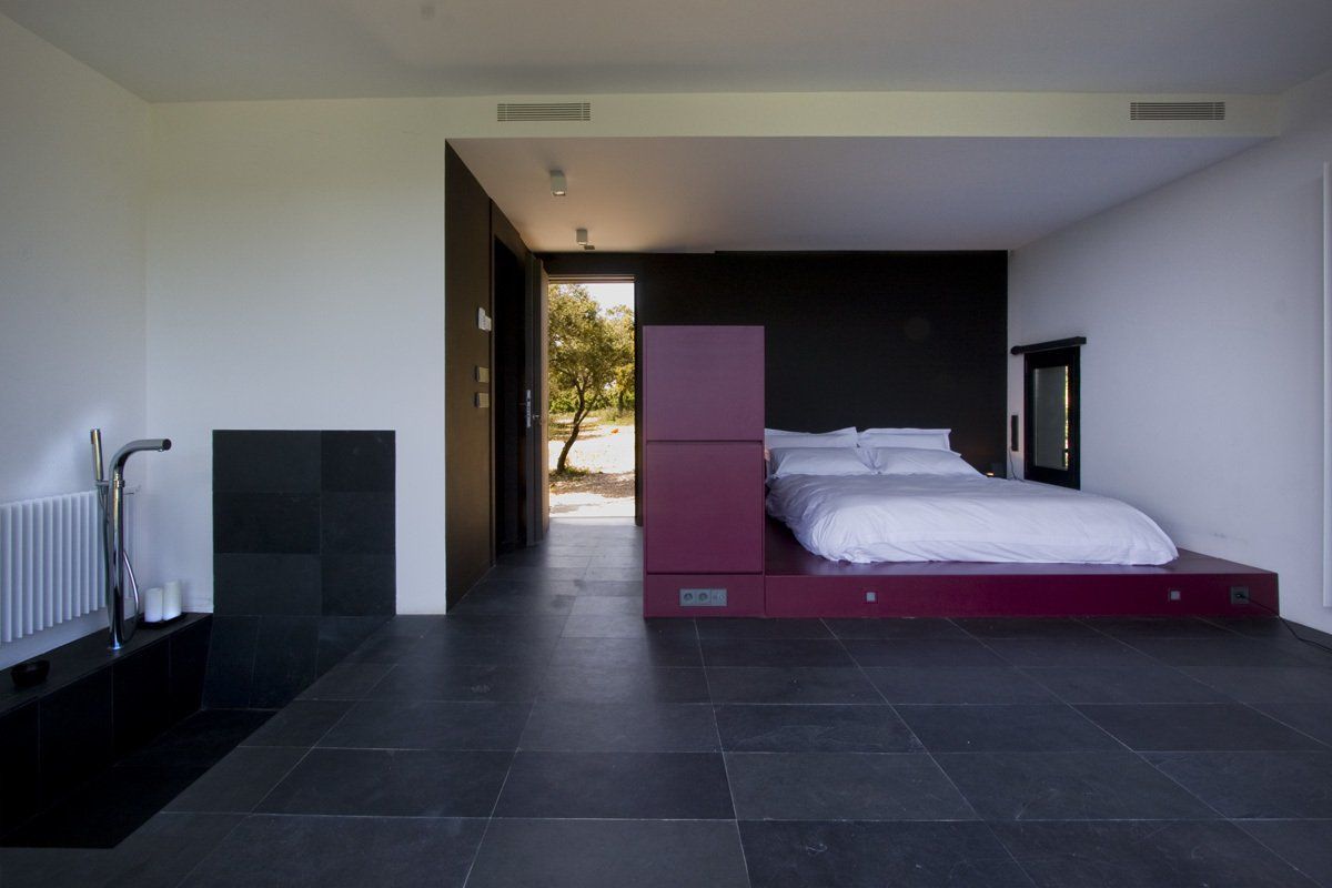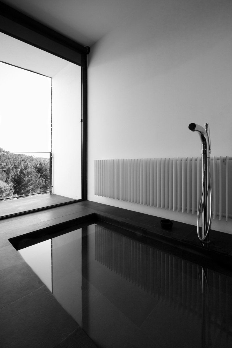Las habitaciones exteriores aparecen entre la vegetación como unas cajas cuadradas y compactas revestidas de pino cuperizado en voladizo sobre una base de hormigón. Están abiertas por una sola cara para tener el máximo de privacidad posible, se colocan en el inicio de la pendiente con el objetivo de disfrutar de las espectaculares vistas y al estar orientada a sur se coloca un porche para protegerse del sol del verano. Por la cara opuesta se produce la entrada y en las otras dos fachadas colocamos aberturas pequeñas para la ventilación i iluminación del baño y de la zona de la cama.