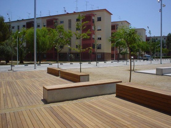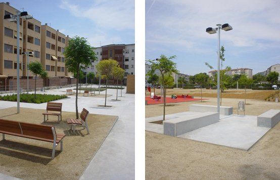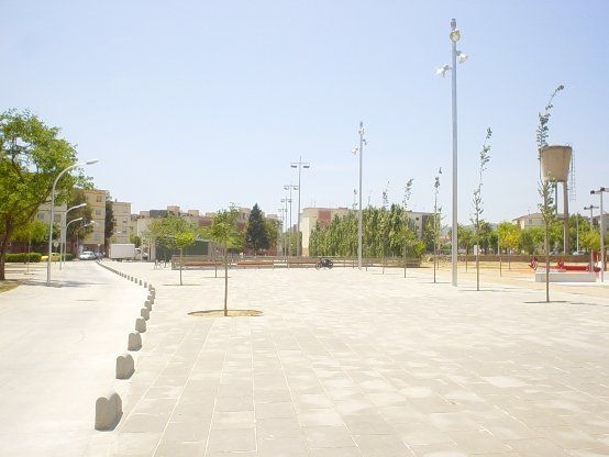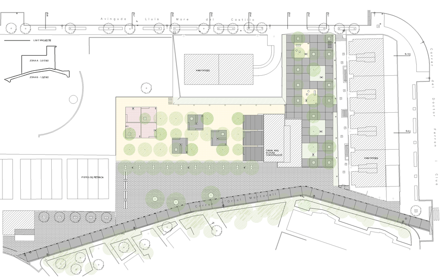 Un primer espacio, de carácter más urbano, resuelve los accesos y la relación entre el futuro "Casal d'Avis" y parte del Poblat Roca a través de la remodelada calle Oriol Martorell. Un segundo espacio, menos urbano, de connexión, garantiza la accesibilidad desde la avenida LLuís Moré del Castillo hasta el futuro Casal y la calle Oriol Martorell. Y un tercer espacio concebido como zona de estar, de juego y con una zona de ampliación exterior del futuro Casal.
