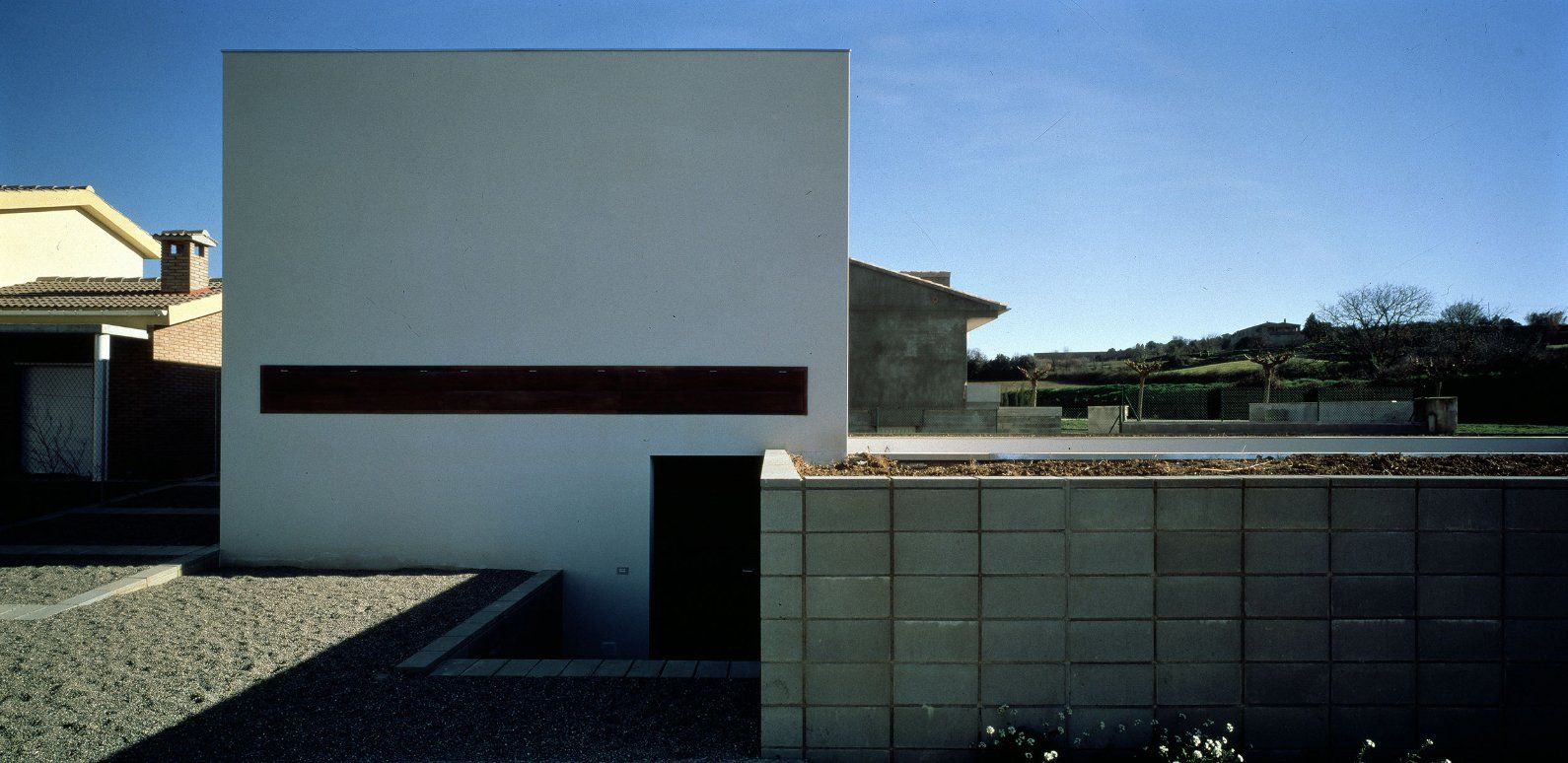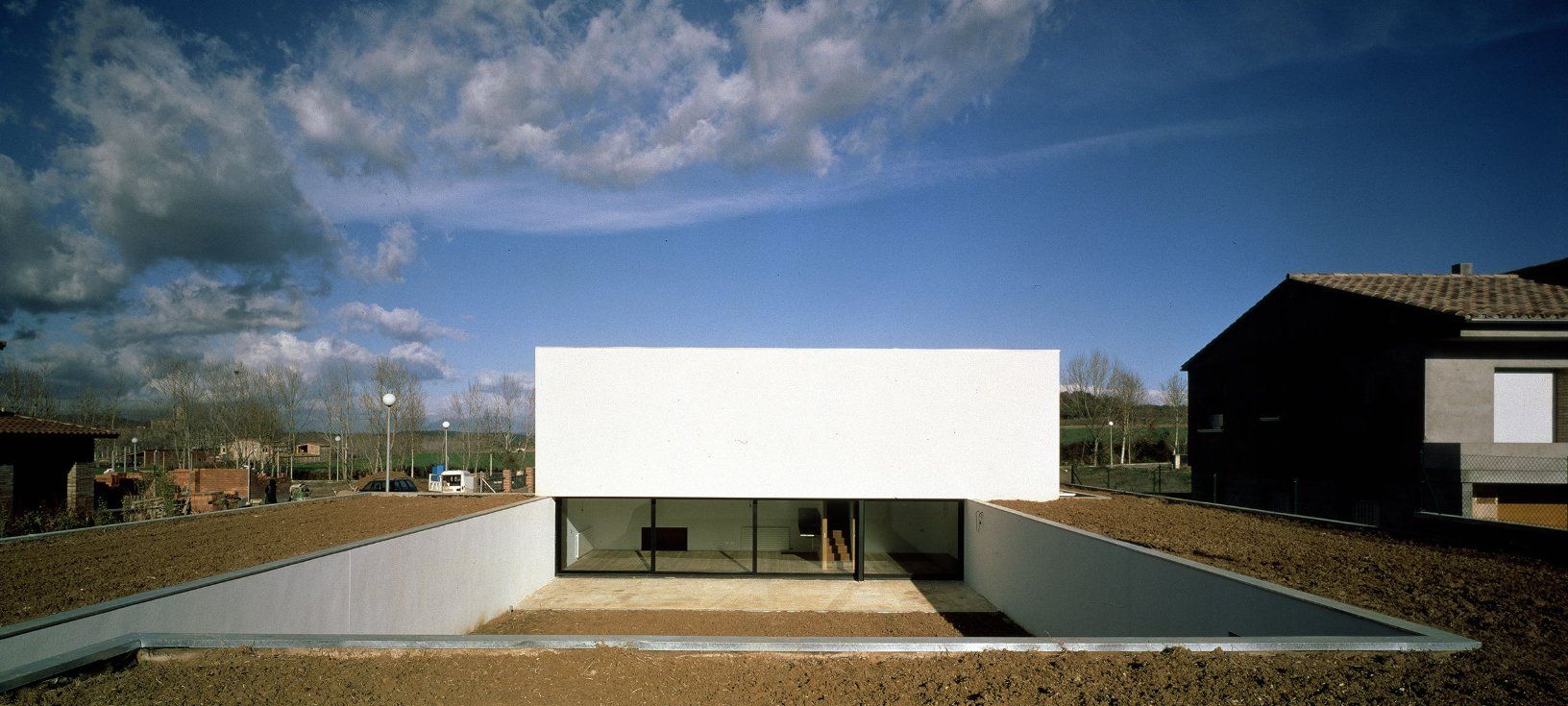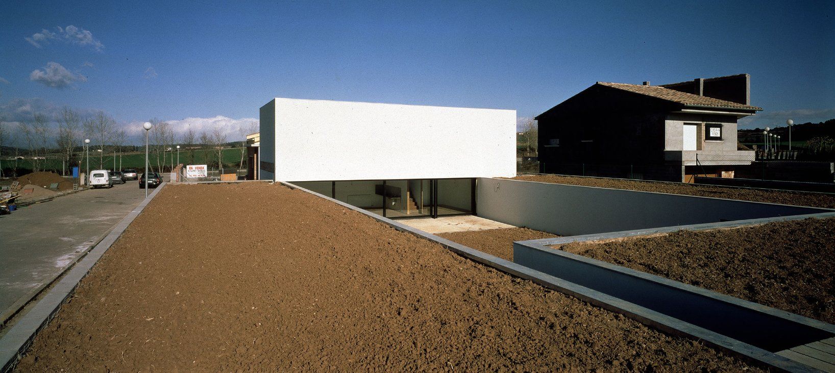 El proyecto, para un cliente excepcional y de bajo presupuesto, responde a un programa atípico de vivienda y sala de exposiciones. La propuesta es consecuencia de las condiciones urbanísticas de un solar de poco interés situado a las afueras del núcleo urbano de Púbol. La construcción pretende apropiarse del lugar y conformar un recinto exterior privado, bien orientado y protegido de la tramuntana. Modificamos la topografía. Rebajamos la tierra de la parte central del solar y la colocamos en los bordes. Construimos unos muros que contienen las tierras conformando un patio cerrado exterior. Sobre estos muros, en el extremo norte de la parcela, situamos un contenedor que deja un vacío en la planta sótano. El vacío abierto al espacio exterior es la vivienda y el contenedor cerrado en si mismo es la sala de exposiciones. La vivienda, de dimensiones reducidas, tiene la fachada norte enterrada y la fachada sur abierta al patio. En el patio, en la parte oeste, construimos un pequeño anexo bajo tierra. La sala de exposiciones, con un acceso independiente a través de una rampa, es un espacio interior aislado que recibe la luz zenitalmente.