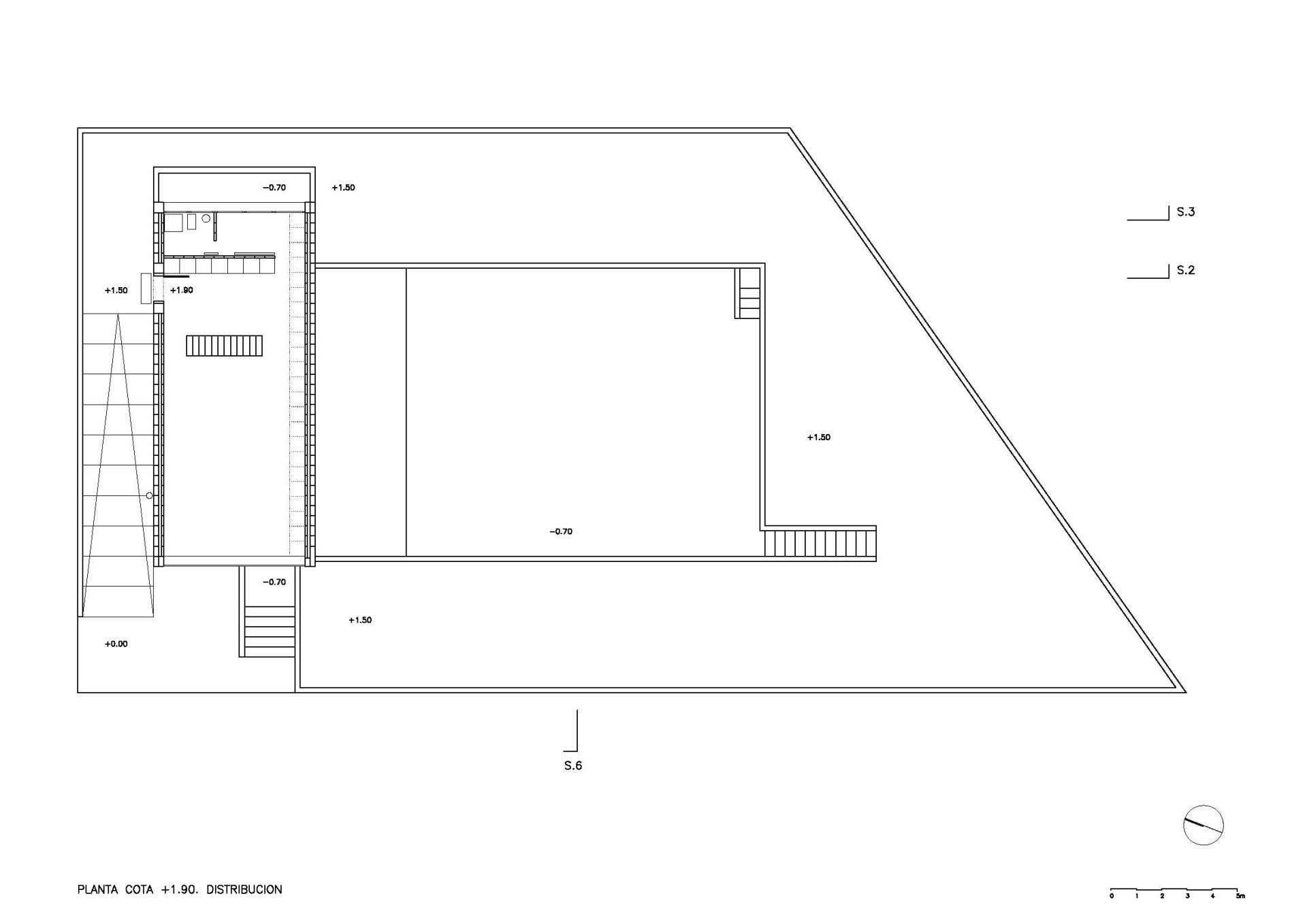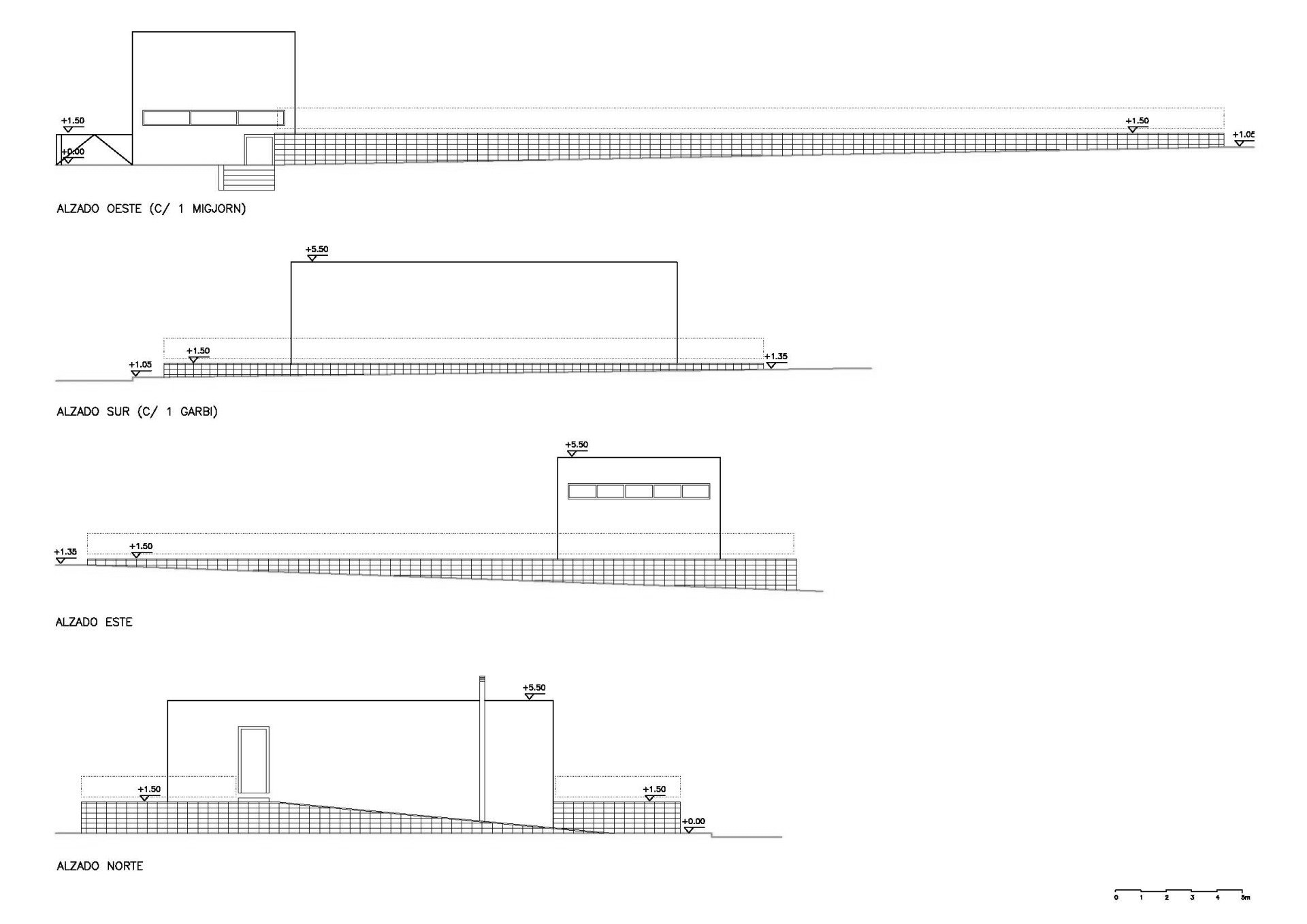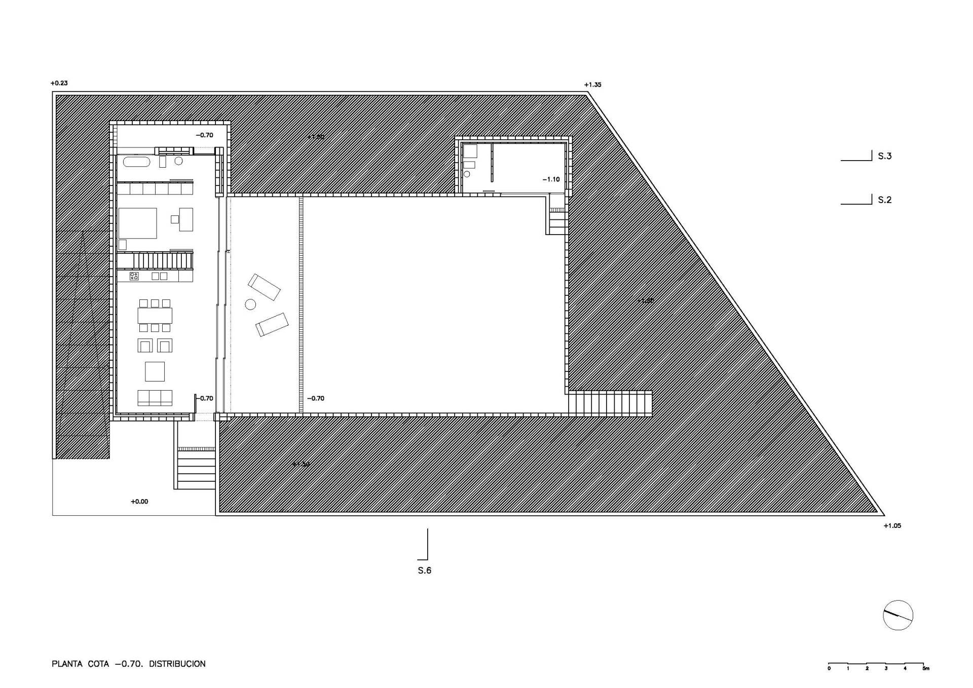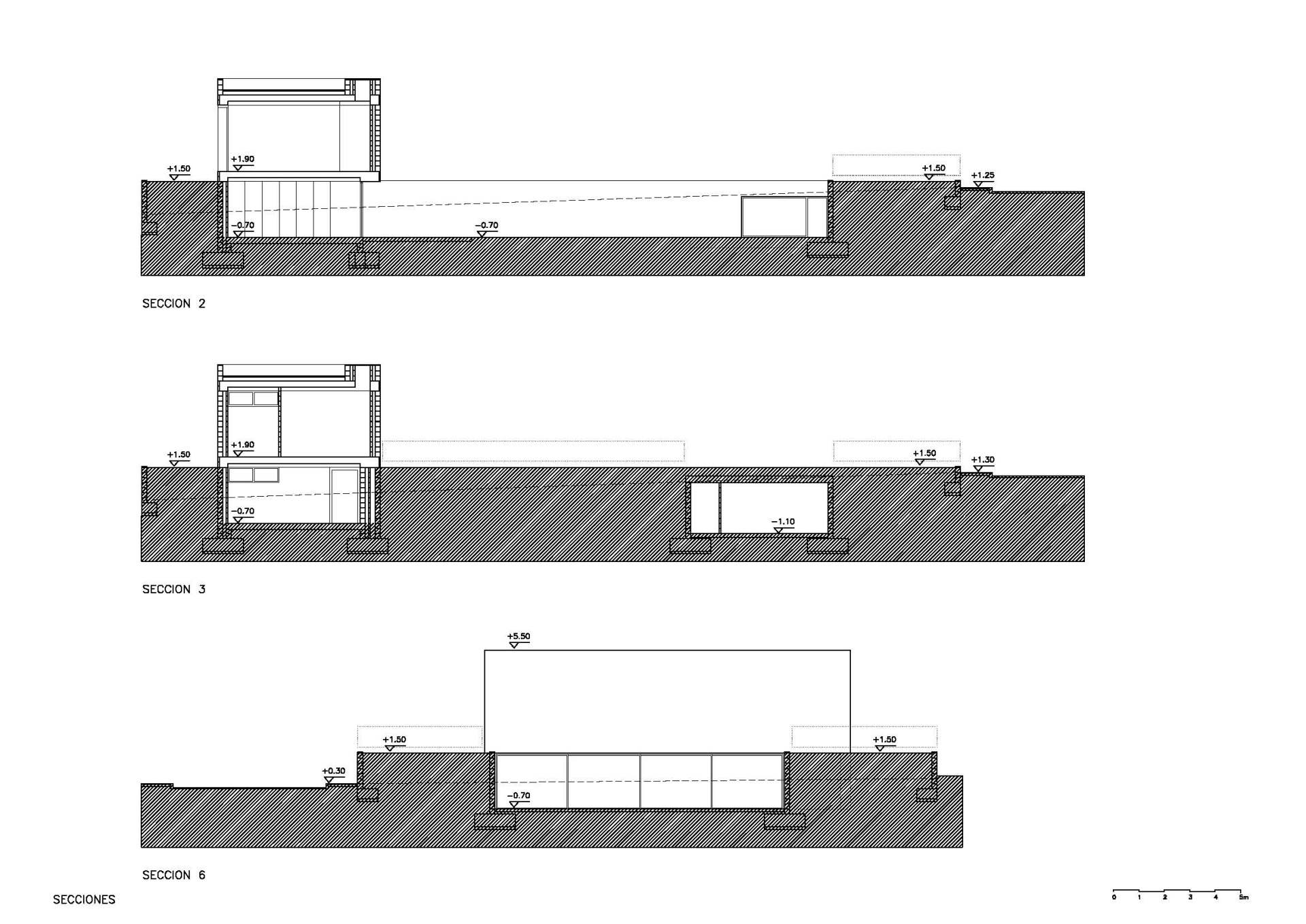 El proyecto, para un cliente excepcional y de bajo presupuesto, responde a un programa atípico de vivienda y sala de exposiciones. La propuesta es consecuencia de las condiciones urbanísticas de un solar de poco interés situado a las afueras del núcleo urbano de Púbol. La construcción pretende apropiarse del lugar y conformar un recinto exterior privado, bien orientado y protegido de la tramuntana. Modificamos la topografía. Rebajamos la tierra de la parte central del solar y la colocamos en los bordes. Construimos unos muros que contienen las tierras conformando un patio cerrado exterior. Sobre estos muros, en el extremo norte de la parcela, situamos un contenedor que deja un vacío en la planta sótano. El vacío abierto al espacio exterior es la vivienda y el contenedor cerrado en si mismo es la sala de exposiciones. La vivienda, de dimensiones reducidas, tiene la fachada norte enterrada y la fachada sur abierta al patio. En el patio, en la parte oeste, construimos un pequeño anexo bajo tierra. La sala de exposiciones, con un acceso independiente a través de una rampa, es un espacio interior aislado que recibe la luz zenitalmente.