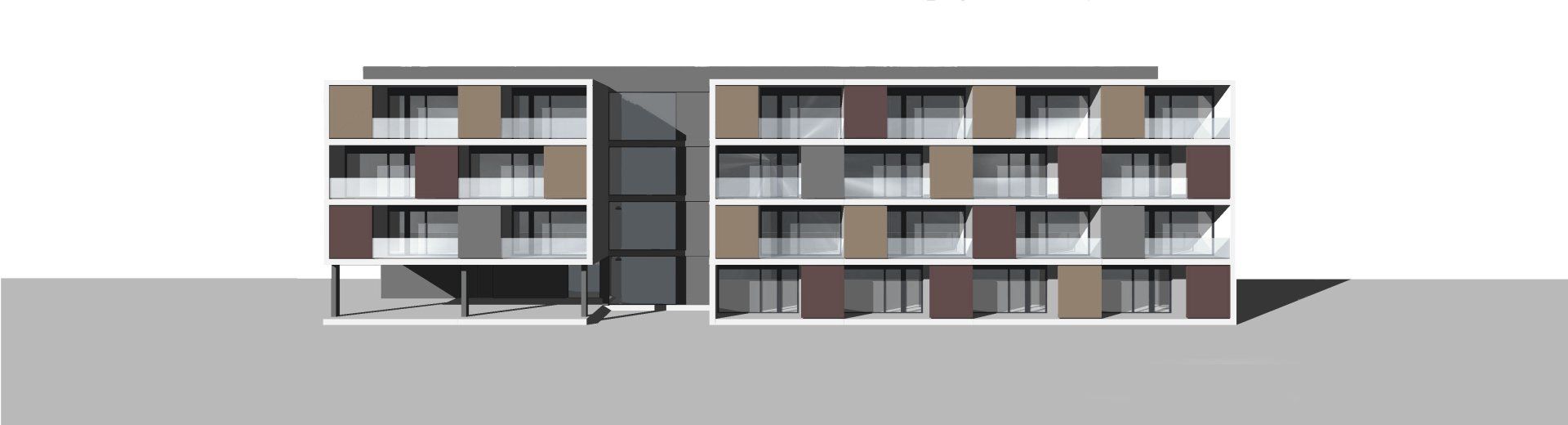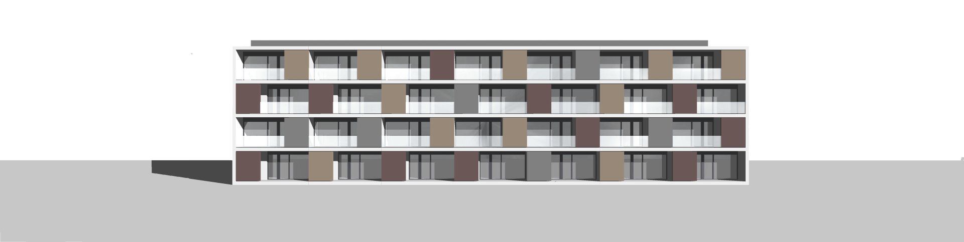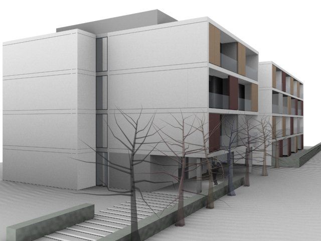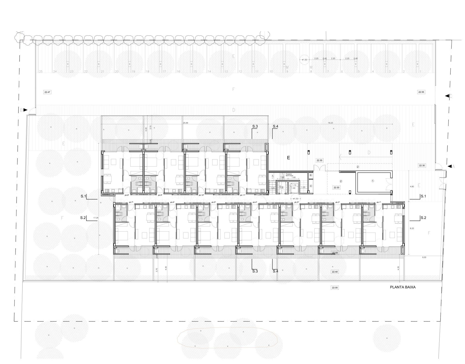 Edificio de planta baja y 3 plantas de piso, con un único núcleo de escalera / ascensor situado en la parte central y acceso por corredor central a las diferentes viviendas. Se utiliza una única tipología de vivienda que simplifica la solución constructiva, se alterna la posición de las viviendas por plantas sin perder la coincidencia de los pasos de instalaciones, para conseguir un dinamismo de alzado y dar privacidad a las puertas de acceso de cada vivienda. En la planta baja encontramos un espacio reservado para una estación transformadora, la reserva para recogida de residuos (CTE HS-2) y el porche de acceso. El acceso al edificio tanto para los peatones como para los vehículos es por la calle Mas de Clariana.