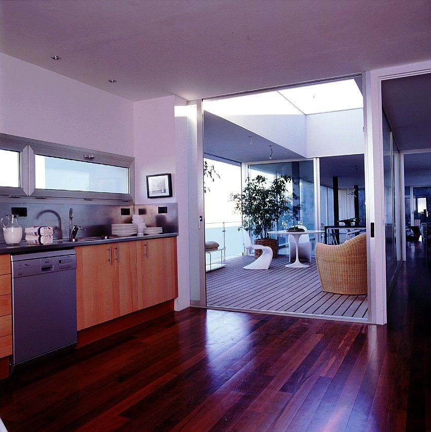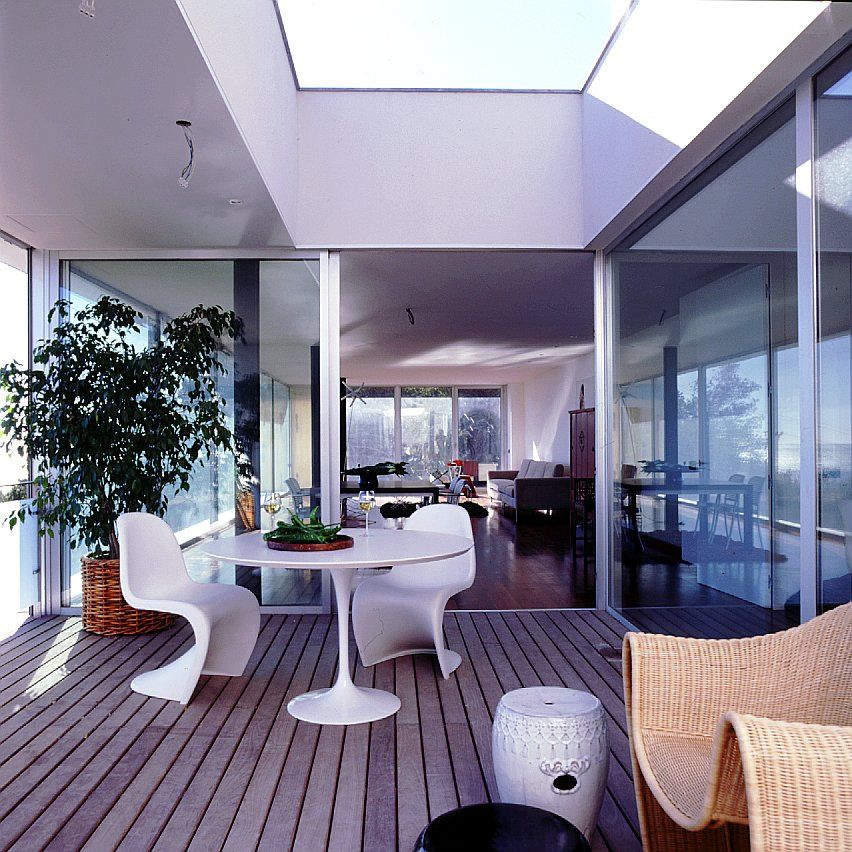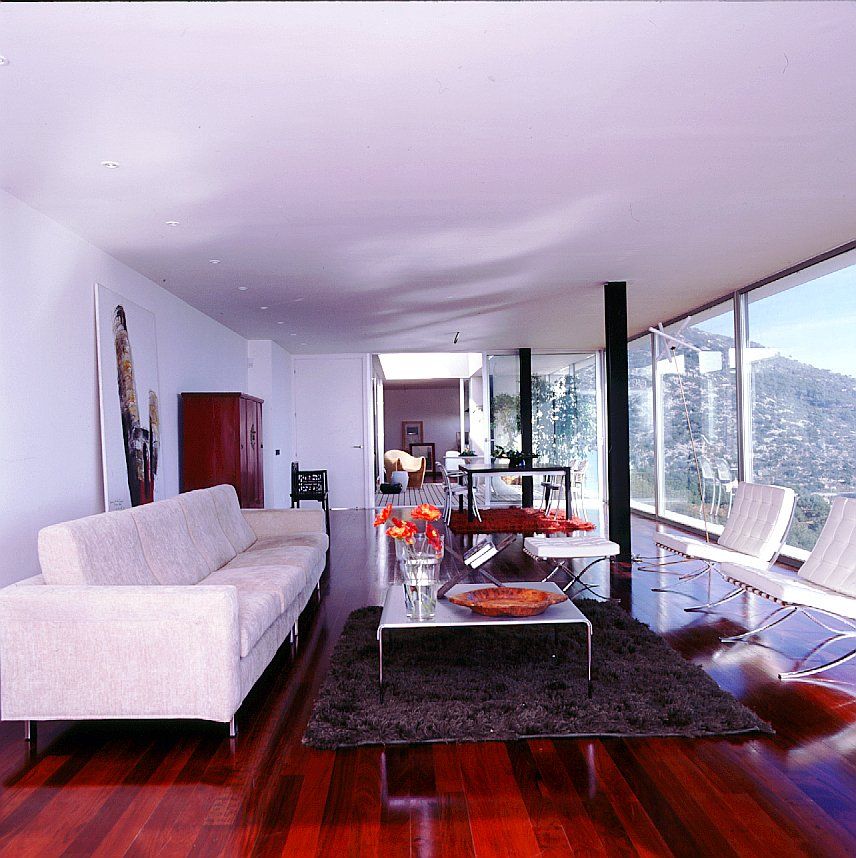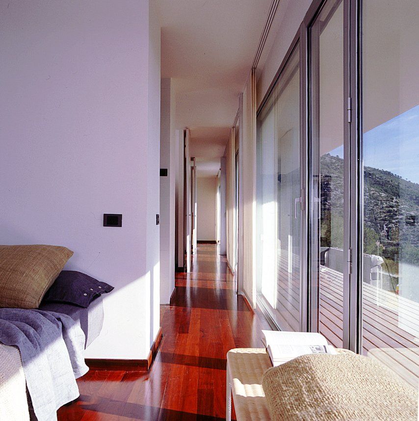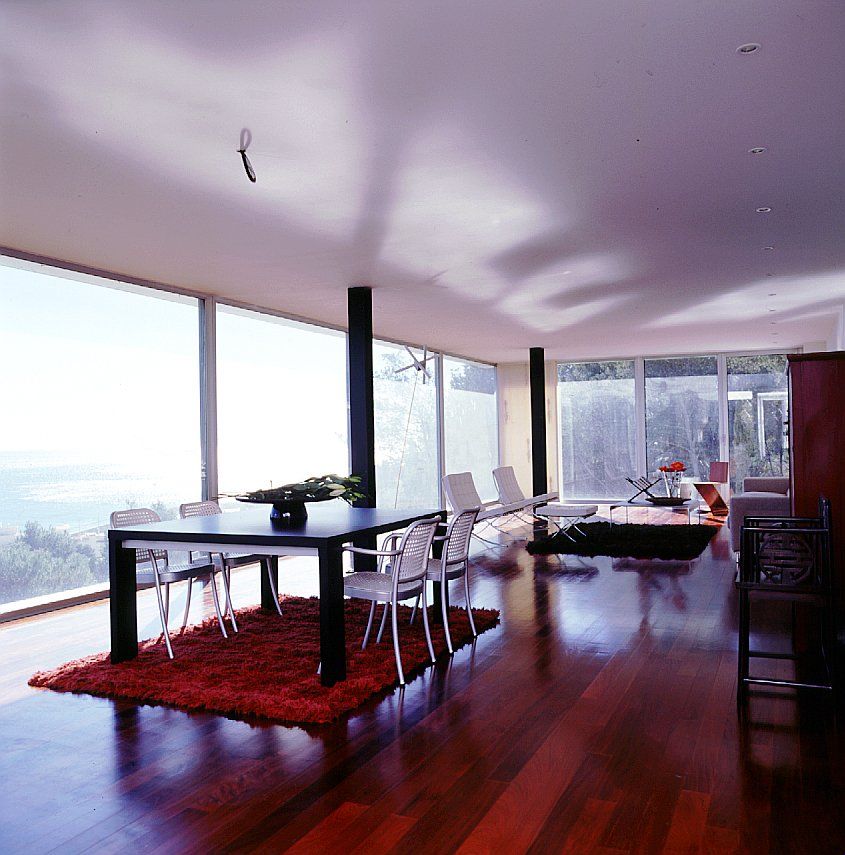 La construcción responde a la organización lineal: el muro actúa como estructura de carga en el lateral norte, mientras que en el otro se recurre a pilares metálicos para conseguir la máxima transparencia.